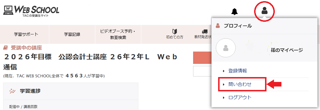 [2]WEB SCHOOLマイページ上部の人型のアイコン内の「問い合わせ」を選択します。