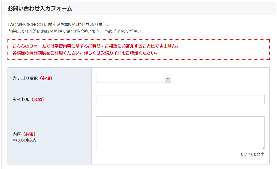 このフォームは「TAC WEB SCHOOLの操作」および「通信生の教材発送」に関するお問い合わせフォームです。