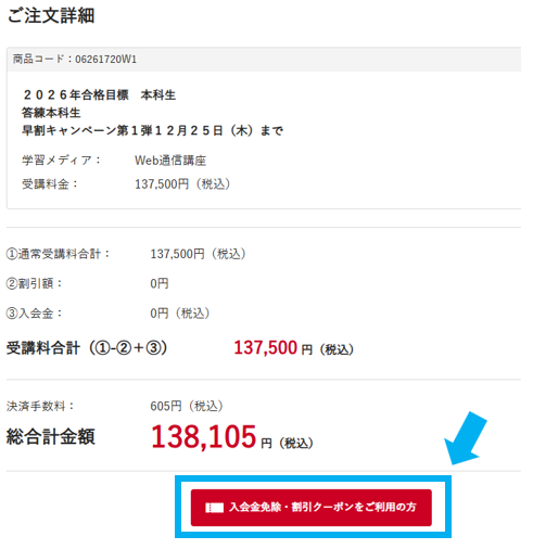 お手元のコードを入力していただきますと、入会金免除の受講料でご購入いただけます。