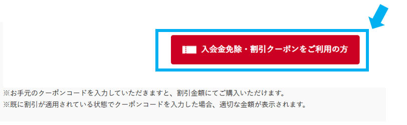 [クーポンコードの入力方法]商品選択 ⇒ お客様情報の入力・確認 ⇒ お支払い金額のご確認 ⇒ ご注文詳細 ⇒入会金免除・割引クーポンをご利用の方
