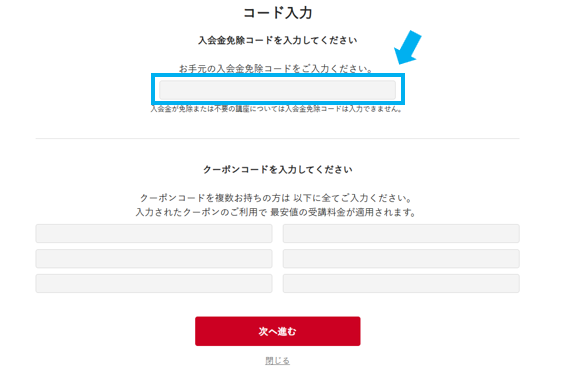 入会金免除券(コード)をお持ちの方は、ご利用いただけます。