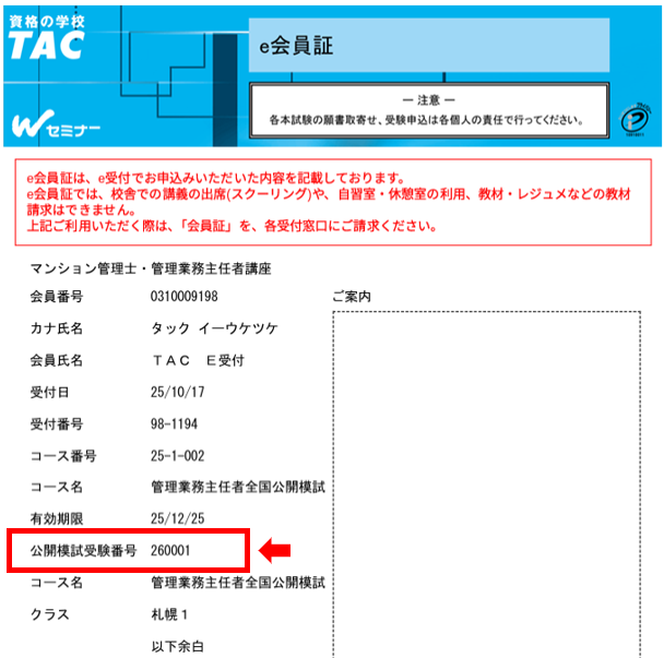 模擬試験をお申込みの場合 e受付マイページ内に表示されます。( e会員証 )